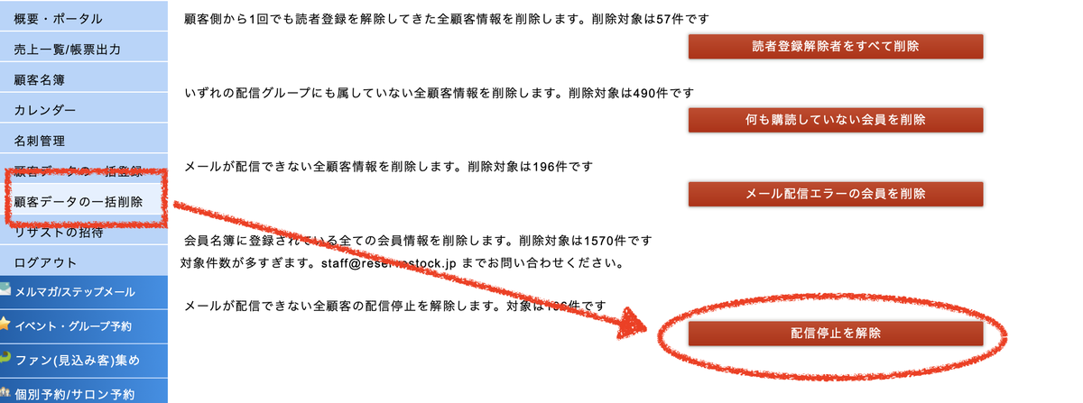左メニューの「顧客名簿の一括削除」から、「配信停止の解除」を押下いただくことで